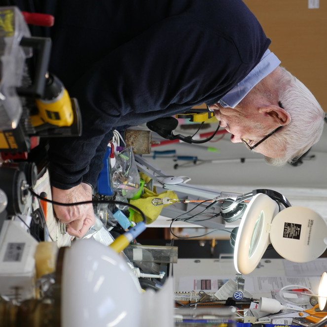 ”Det her er til Carl!” lyder det, da to møre flyttekasser fyldt med lamper bliver sat forsigtigt på gulvet bag reparationsstationen, hvor Carl allerede sidder med arbejdslyset tændt og den første ”patient” på bordet.